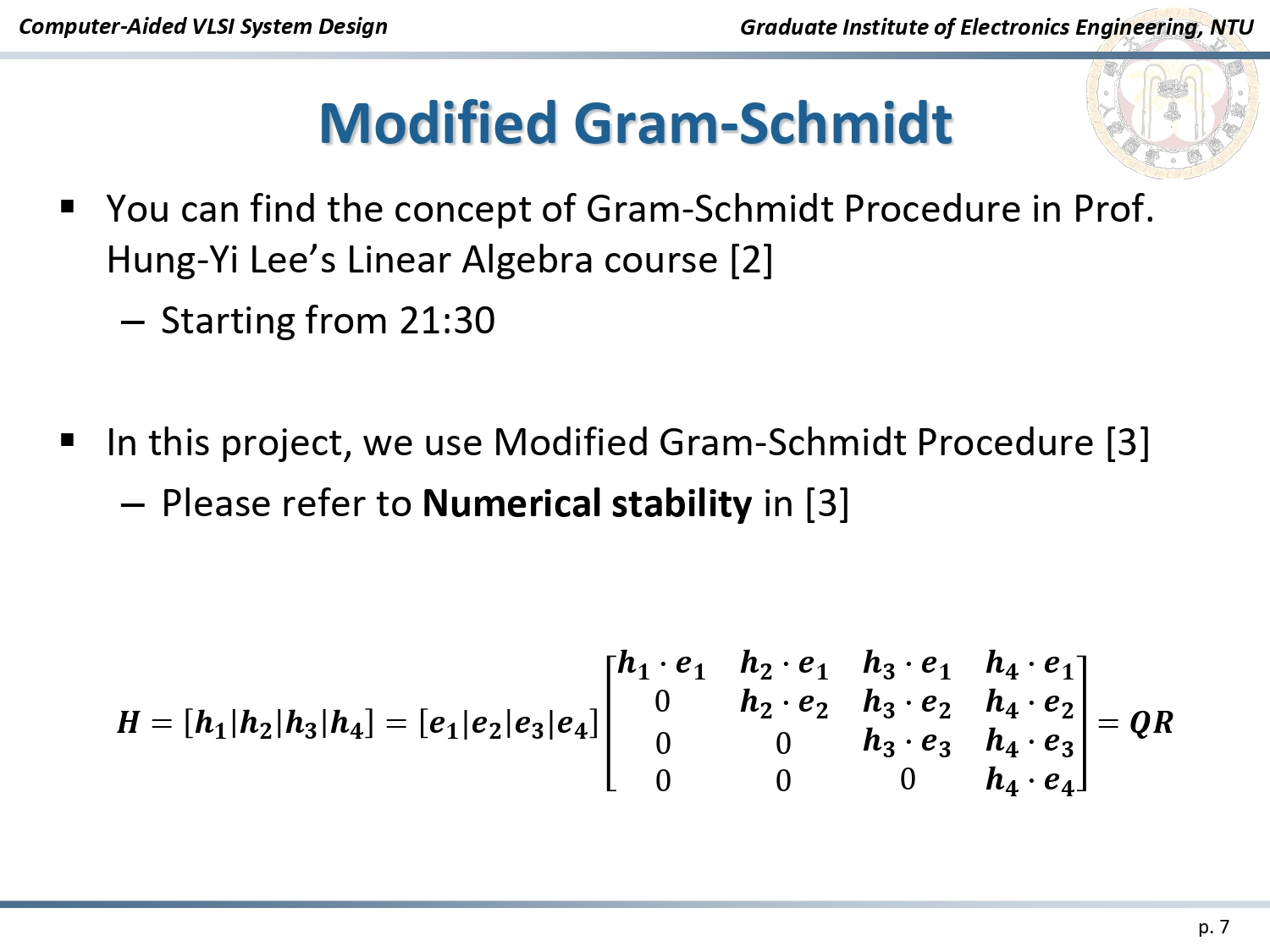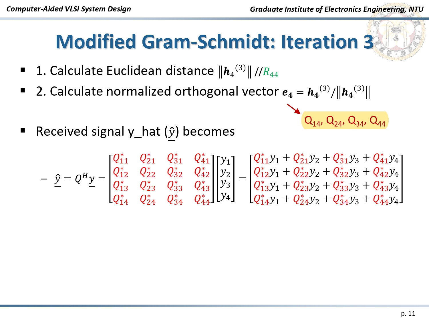 The implementation is based on the Modified Gram-Schmidt algorithm, which decomposes the channel matrix (H) into: