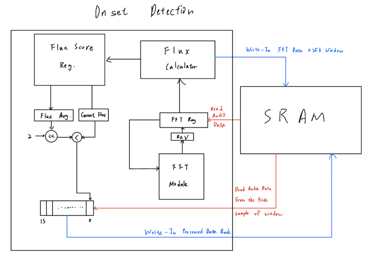 Uses SRAM to store intermediate FFT results and onset data, ensuring efficient resource usage.